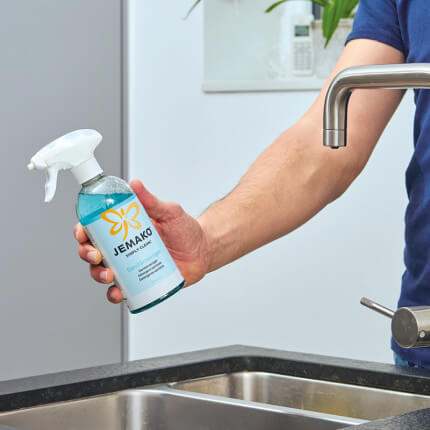 - Bei starker Verschmutzung: Sanitärreiniger unverdünnt auf das feuchte Profituch geben und Oberflächen sowie Armaturen reinigen. Anschliessend gründlich nachspülen oder mit einem feuchten Profituch nachreinigen.
