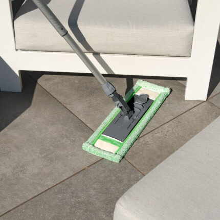 Die perfekte Kombi aus Bodenwischgerät, drei Bodenfasern und zwei Reinigern für matte, raue Böden, geölte/gewachste Holzböden sowie das Nachwischen/Trocknen aller Böden.