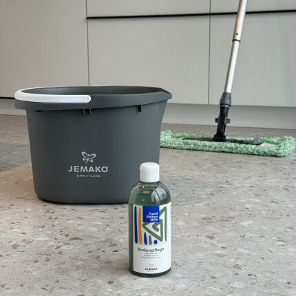 Bodenpflege ins Wischwasser geben (Dosierungsverhältnis: 1:500; z. B. 10 ml Bodenpflege (1 Verschlusskappe) in 5 l Wasser) und den Boden mit der entsprechenden Bodenfaser feucht reinigen. Anschliessend mit der weissen Bodenfaser nachwischen und das verbliebende Wasser inkl. Restschmutz aufnehmen.