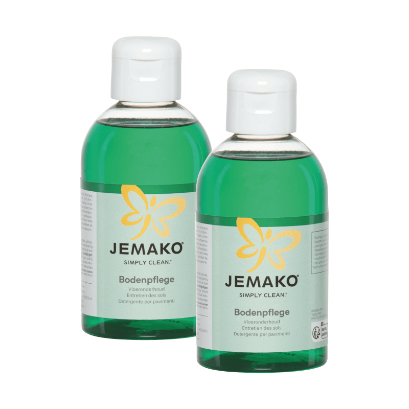 Bodenpflege ins Wischwasser geben (Dosierungsverhältnis: 1:500; z. B. 10 ml Bodenpflege (1 Verschlusskappe) in 5 l Wasser) und den Boden mit der entsprechenden Bodenfaser feucht reinigen. Anschliessend mit der weissen Bodenfaser nachwischen und das verbliebende Wasser inkl. Restschmutz aufnehmen.