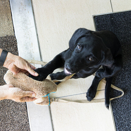 Strofinare con il Panno per pelo il pelo bagnato e/o sporco e le zampe per asciugarli. Per staccare lo sporco secco dal pelo, inumidire parte del Panno per pelo e pulire miratamente in punti interessati. Quindi asciugare con la parte asciutta.