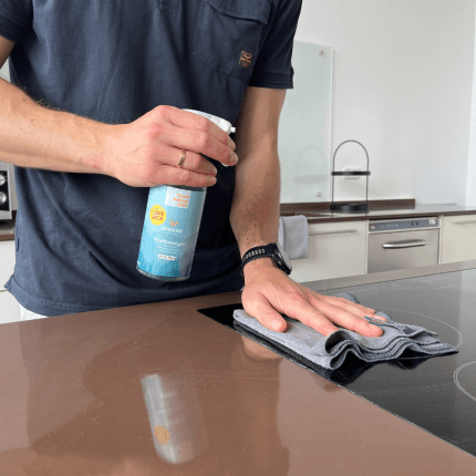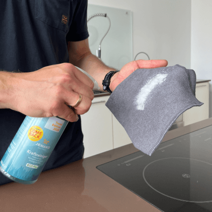 - Spruzzare il Detergente forte a scelta sul Panno professionale, sul Panno lavastoviglie o su una fibra verde JEMAKO e pulire la superficie. Sciacquare o passare un panno bagnato – ecco fatto!