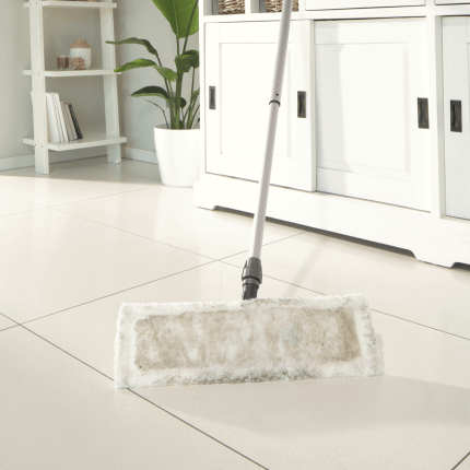 - Asciugatura: dopo aver lavato, passare semplicemente la fibra bianca e asciugare il pavimento. La particolare struttura della fibra assorbe in modo ottimale l’acqua restante e lo sporco. Resta solo un pavimento pulito e senza aloni.