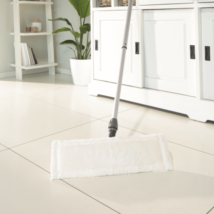 - Nadrogen: na het vochtig dweilen gewoon de witte vezel op de Vloerwisser zetten en de gereinigde vloer vervolgens nog eens nadrogen. De bijzondere vezelstructuur van de witte vezel neemt uitstekend het achtergebleven dweilwater en het daarmee losgeweekte vuil op. Het resultaat is een schone en streeploze vloer.